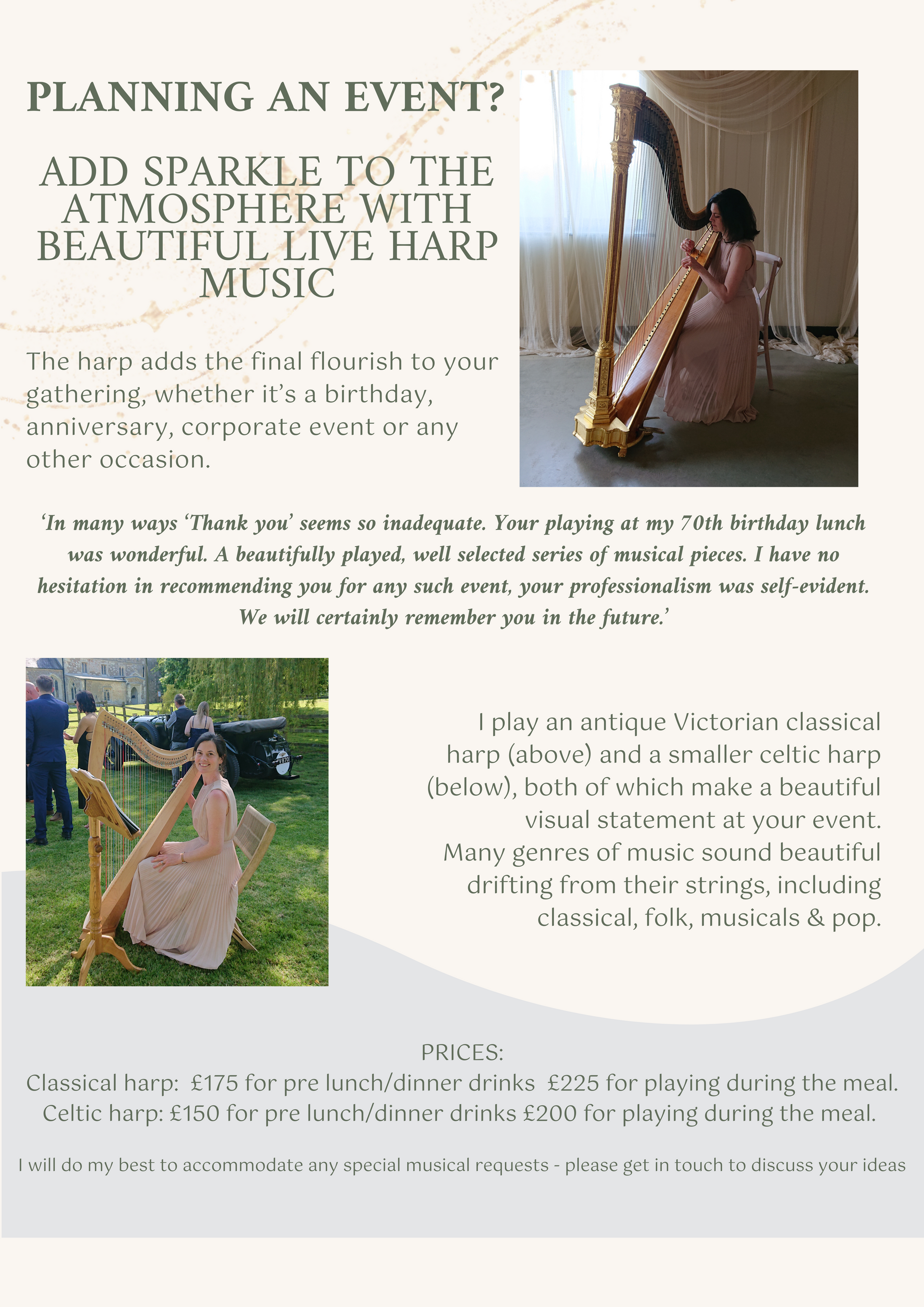I'm a certified harp therapist through the International Harp Therapy Programme and have studied Arpaterapia Immaginativa with leading Italian harp therapist Ludwig Conistabile. I have a special interest in playing for people who can benefit from the unique sound the harp makes, be it in hospital and hospices, for yoga, meditation or relaxation sessions, or for one to one bespoke sessions (see Connect to your Calm, below). I also play classical harp and offer background music for weddings, birthdays and other events.